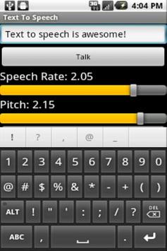 Text to speech is an app to make your droid talk. You can enter text and it will say it. You can change the speed and pitch of the voice. It is designed for 2.2 or newer.