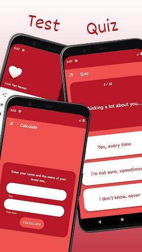 Test your love compatibility with Love Test: Names app! Enjoy this love tester and calculator, and play with your friends or crush.