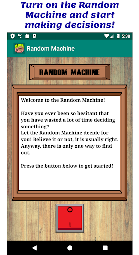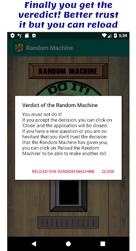 This application will help you make your day-to-day decisions and also add some intrigue. Simply ask yourself a question about something you should do or not do and let the Random Machine advise you on the decision you should make. You will not regret!