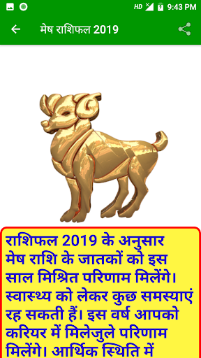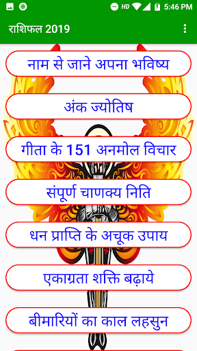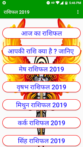 Mesh (Aries), Vrush (Taurus) , Mithun (Gemini) , Kark (Cork), Singh (Leo), Kanya (Virgo), Tula (Libro), Vrishichal (Scorpio), Dhanu (Saggitarius), Makar (Capricorn), Kumbh (Aquarius), Meen (Pisces) In Hindi Language Rashifal 2019 is an app which provides full Yearly Horoscope an easy way and you can also know many others interesting things about you and your life. This app is based on Indian Astrology, Predictions, Numerology, and Lalkitab rashifal for all Rashis in Hindi language. Hindi Calander Daily Horoscope In HIndi