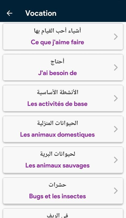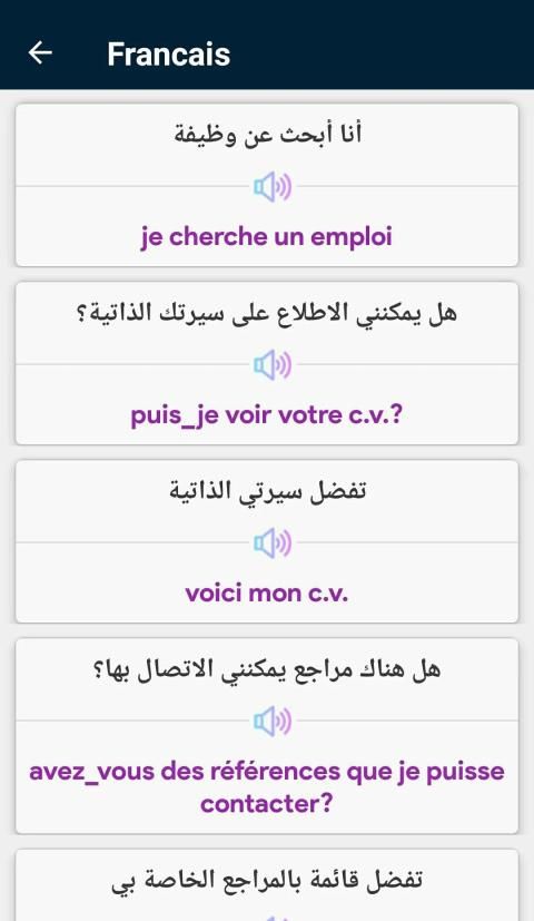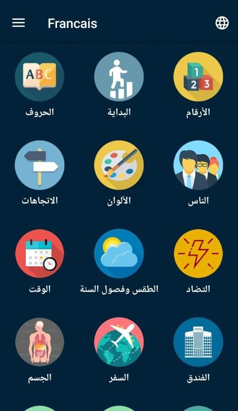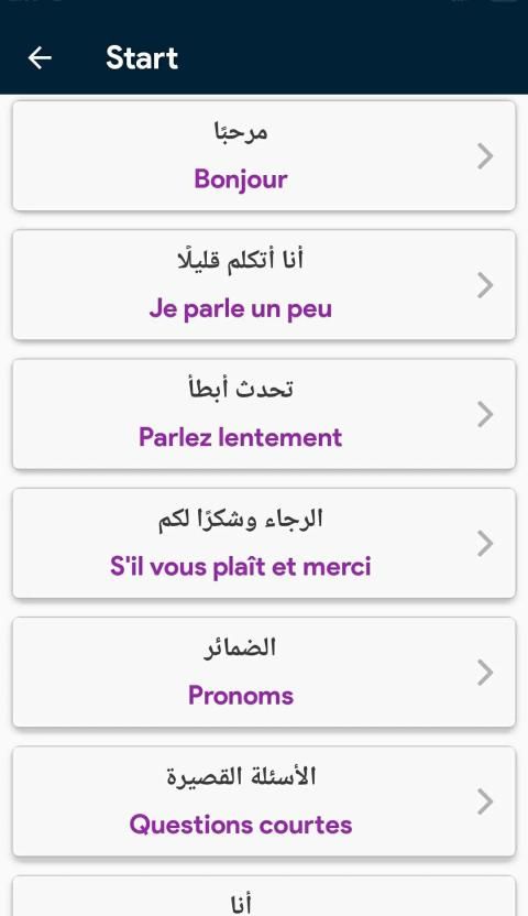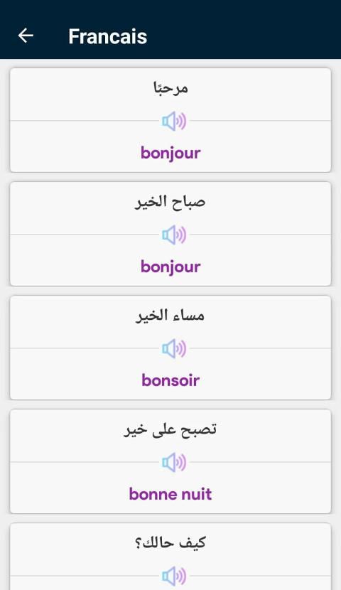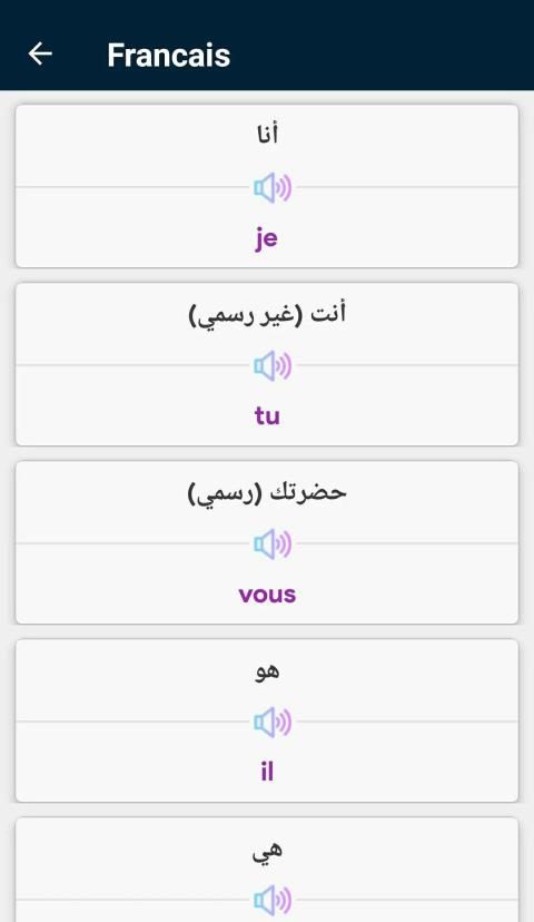 تطبيق لتعلم اللغة الفرنسية بالصوت التطبيق الاشمل لكل من يريد دراسة اللغة الفرنسية بجدية وبشكل صحيح وأن لا يواجه أي صعوبة في انشاء جملة مفيدة و مفهومة أثناء الحديث أومشاكل في فهم قواعد اللغة