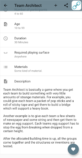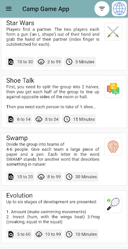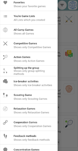 In this App, you can find all the greatest and best Games for you're Summer Camp. Save them for later and have a direct look on which materials you need to play them. Hours worth of Games for Kids & Teenagers, with this app you'll always have something to play. Get the best games for your Scouting group and enjoy the big database. of Scouting and Summer camp games.