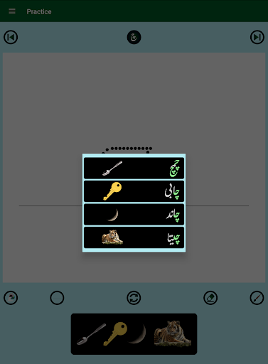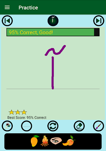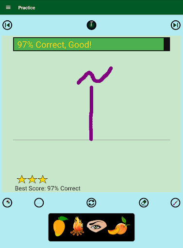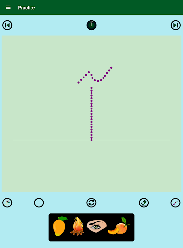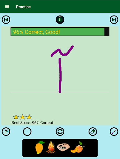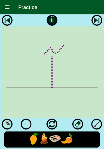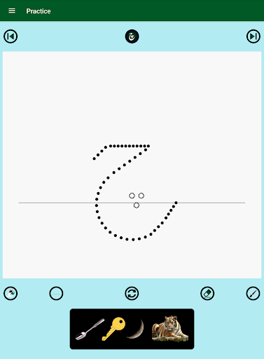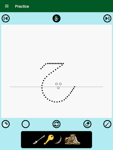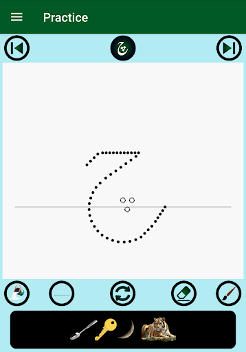 2. Each alphabet has four words with images and pronunciation audios, an animation of the guided dots to follow for writing practice on a notepad view, and a real-time evaluation of the practice attempts with saving the best score. The notepad lines, background color, and brush color can be changed as desired.