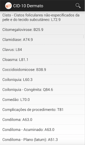Tabela CID-10 para consulta de doenças relacionadas à dermatologia. A pesquisa pode ser feita pelo código da doenças (ex.: L70.8) ou pelo nome da doença (ex.: acne artificial). Tabela em conformidade com a da SBD-SP (Sociedade Brasileira de Dermatologia) e disponível em: http://www.sbd-sp.org.br
