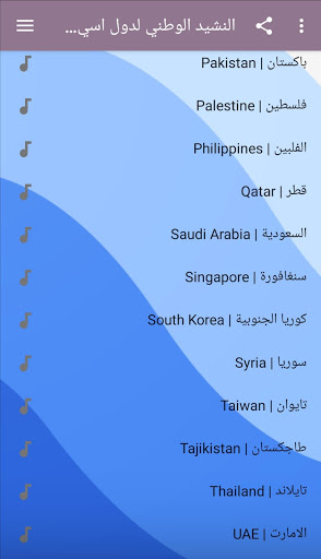 يمكنك تطبيق النشيد الوطني لدول اسيا من الاستماع لجميع الاناشيد الوطنية لدول قارة اسيا والتنقل بينها بكل سهولة ويسر، بالاضافة لوجود أعلام الدول أيضاً بطريقة مرتبة حمل تطبيق النشيد الوطني لدول اسيا الان