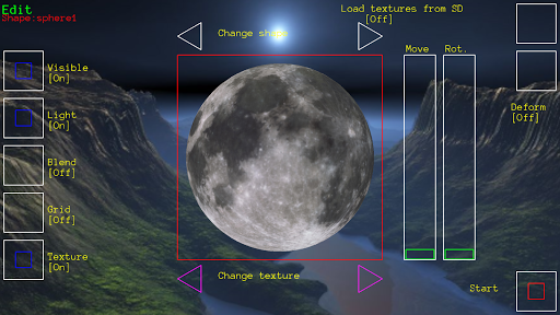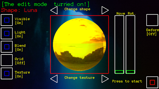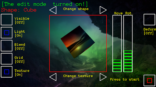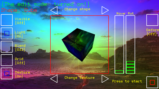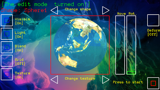 At program start appears on the scene a 3D model and shapes (pyramid, cube, 2 spheres) . Figure and 3D model are in motion. You can only manage active figure. To activate the pieces you need to touch her. The active figure or 3D model is controlled by scrolling horizontally and vertically, and also in the "control" of the corresponding buttons ("Visibility", "Aside","Right","Stop"). Also, there are buttons to go to edit mode (Edit) and help ("Help") .
