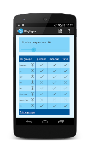 Les verbes et les temps à reviser peuvent être réglés très précisement, en choisissant un ensemble de combinaisons temps / sous-groupes.
