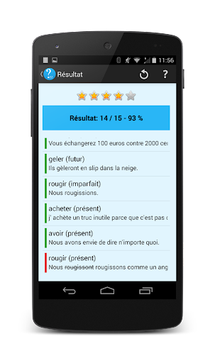 A la fin du quizz, Conjuquizz présente le résultat. Les questions répondues correctement sont marquées en vert. Les questions répondues incorrectement sont marquées en rouge. La réponse incorrecte de l'utilisateur est rapellée, et la bonne réponse marquée à coté.
