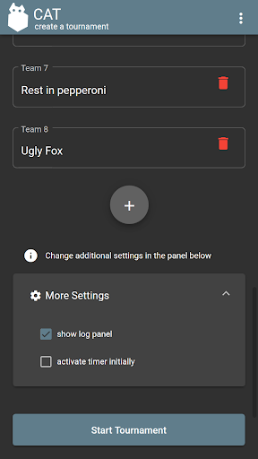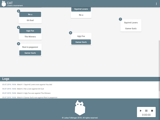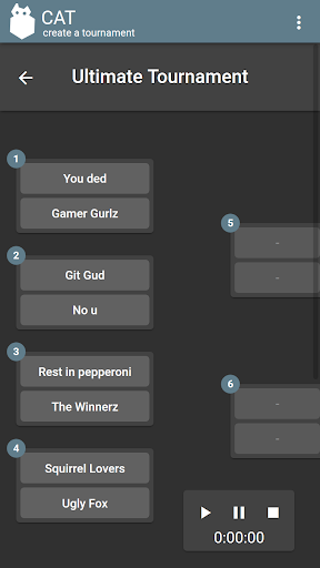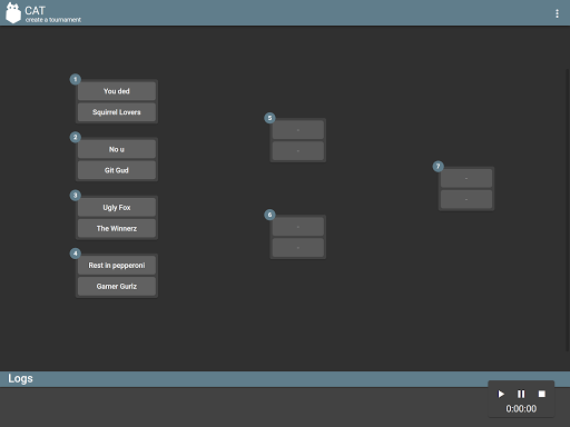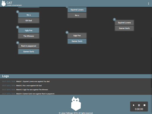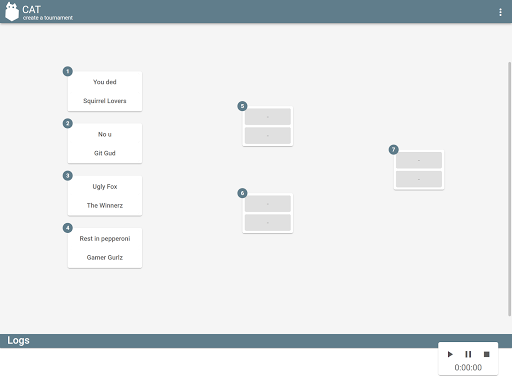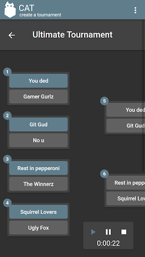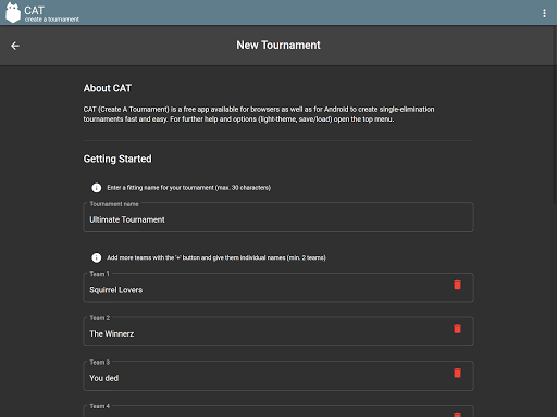 CAT (Create A Tournament) is a free application available on mobile for Android and as a web-application for all browsers to create single-elimination tournaments fast and easy.