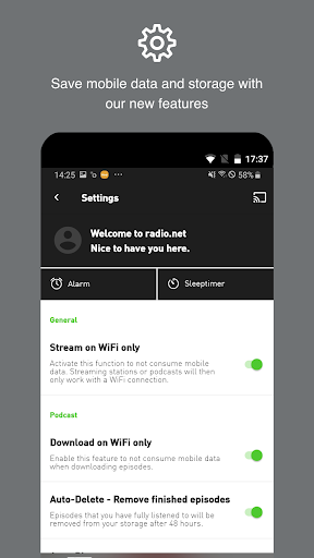Use the radio alarm and wake up to the station or morning show of your choice every morning. Just select the station, wake-up time and set the volume on your phone. Want to snooze your favourite station or podcast too? Then simply select your preferred time using the sleep timer function and your radio station or podcast will play when you want it to.