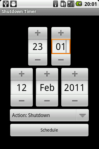 schedule your device to shutdown reboot hot reboot switch into flight mode at a certain time.Just select the time and action to perform and click the schedule button.Developed and tested on cyanogenmod 7Other firmwares may also work Requires root
