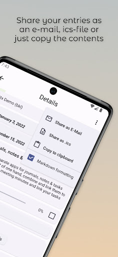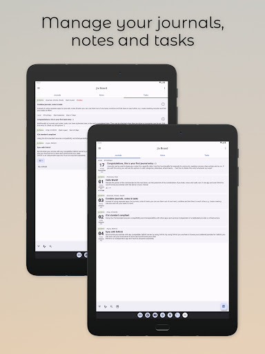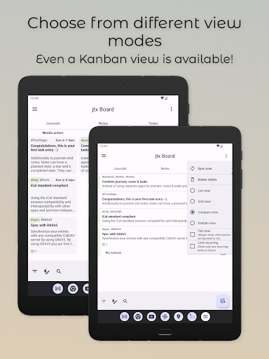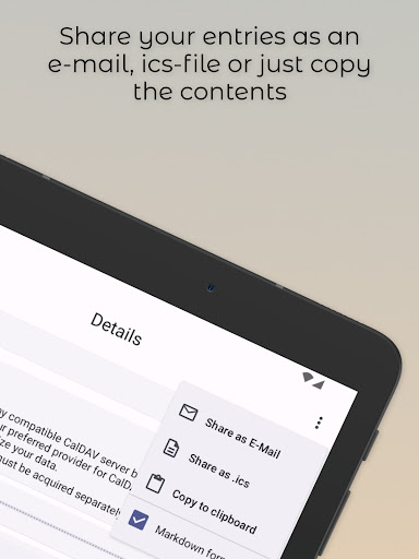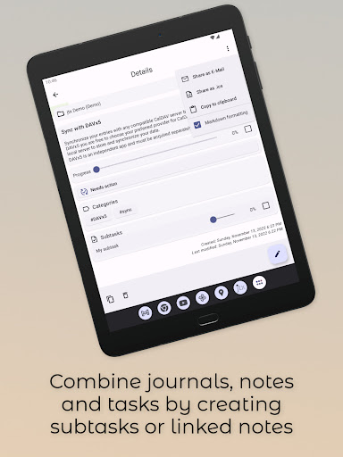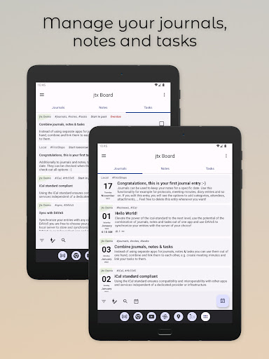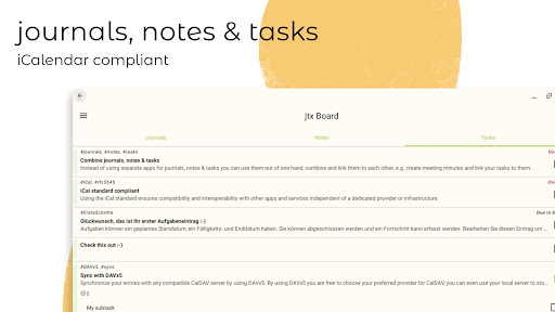 Elevate the power of the iCalendar standard to the next level, use the potential of the combination of journals (VJournal), notes (VJournal) and tasks (VTodo) out of one app and use DAVx5 to synchronize your entries with the CalDAV-server of your choice!