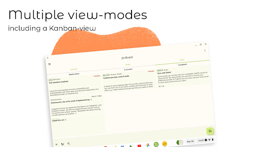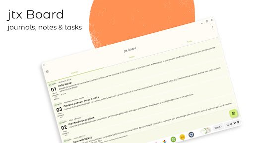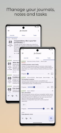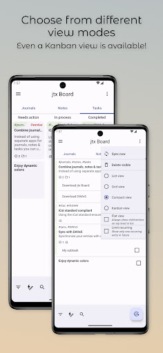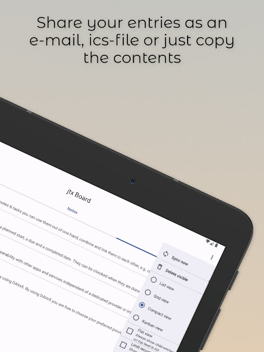 Your data can contain private and sensitive data by their nature. We believe that individuals and companies should be able to be in full control of their own data. This means the freedom to choose where and how the data are stored, and freedom in choice of software. That is why we chose DAVx5 as a Sync Adapter to synchronise your data between your phone and any compatible CalDAV-server. The source code for jtx Board is publically available - find out more on https://jtx.techbee.at !