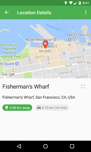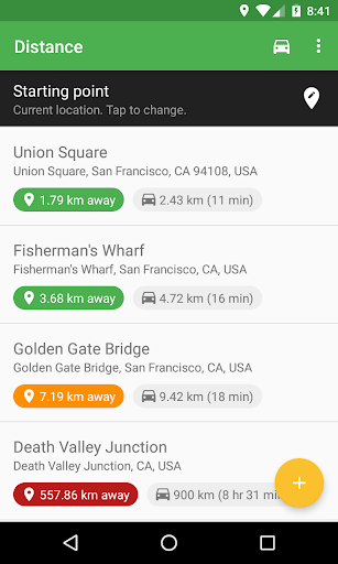 Add places by picking them on a map or entering the address. You will see an ordered list of the places you have added and how far away each place is from your current location. You can use your current location or any other place as starting point for distance calculation.