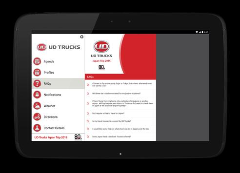 The UD Trucks Japan Experience App gives you up-to-date information on the tour’s agenda, optional tours, directions and other information about the factory and surrounds. Within the app you will also find a currency converter, weather information and useful Japaneese phrases. Arigatou!