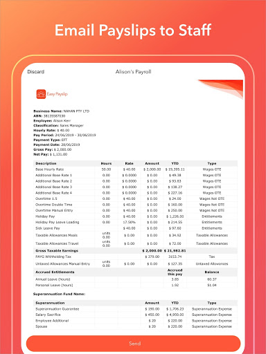 Easy Payslip lets you process payroll and email employee payslips direct from your smartphone (and our website - mix and match!), And best of all, its STP compliant and ATO approved, so you’re covered for Single Touch Payroll (STP) making it simple for small business owners to manage their payroll obligations on the go, including employee allowances, overtime, entitlements and superannuation. Multiple account access for your accountant or partner (invite via website).