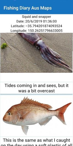 My Fishing Diary allows you to capture images and add text for any location you have fished at. You can add notes to each individual image and use images from your gallery or camera. And setting the exact location is easy with a cross hair target that repositions as you move the map.