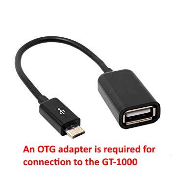 Connection is via a USB cable and an OTG ('On The Go') adapter. The OTG adapter is required to enable the android device to talk to the GT-1000.