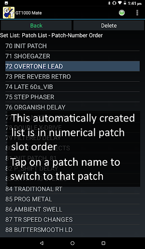 Ordered lists of the patches are created automatically. By tapping on a patch name in the list, the GT-1000 is switched to the specified patch. The switching is very fast - ie sub-second.