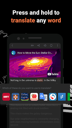 TRANSLATE Translate new words and whole sentences directly from Suby. All new words and sentences containing them are saved to your local dictionary.