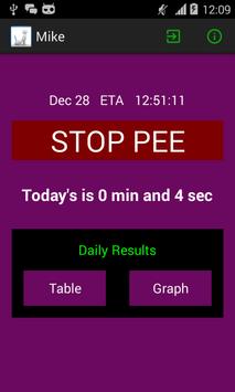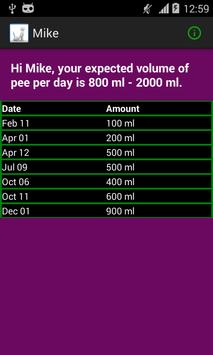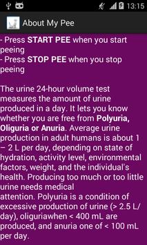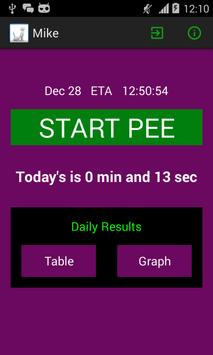 My Pee records the total time that you peed. Using the average pee rate, it calculates the volume of pee per day. The average pee rate varies by gender and age of the user!