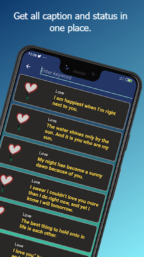 In CAPTUS you will more than 700 different type of caption and status with more than 10 different categories. Above all you can search the status also. and you will get all the items in one place also. Hope you will like my application. And please let us know about your feedback.