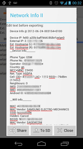 •Current mobile Cell and any neighbours, along with their signal strength, location info and type.