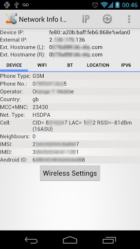 Shows info about the phone and the current network, Bluetooth, IPv6 and Cell connection.