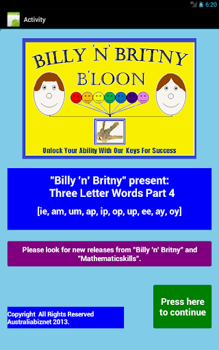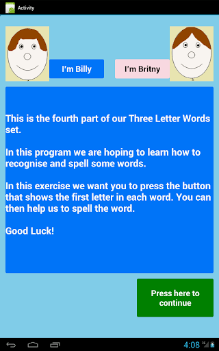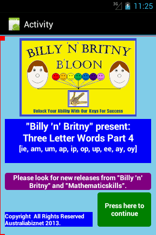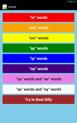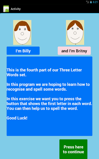 The application is designed to help children recognize and spell a number of 3 letter words.