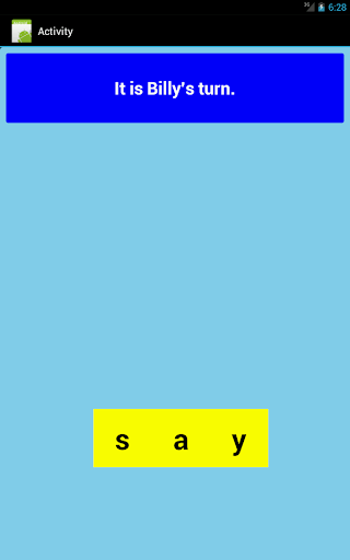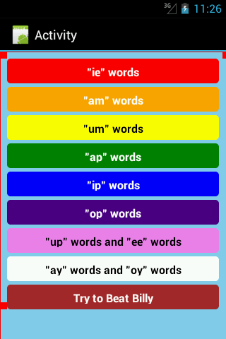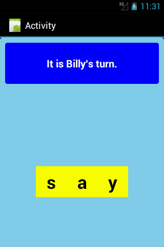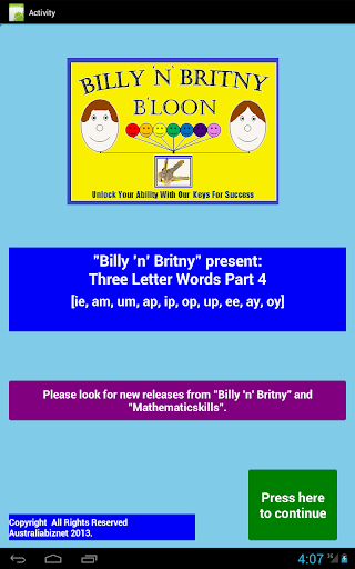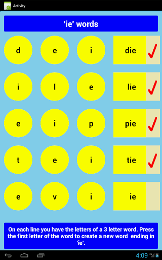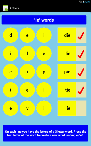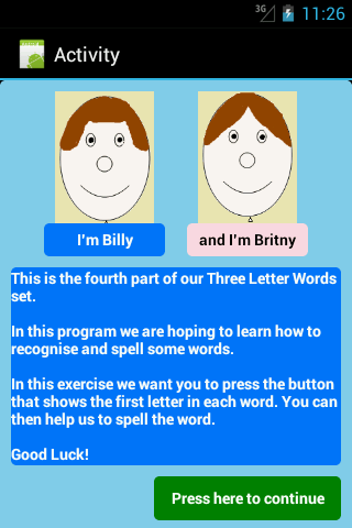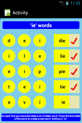 Users will be required to select from each line of 3 letters, the first letter of a 3 letter word. The remaining letters complete the word. When the correct letter is selected the app will spell and say the word aloud.