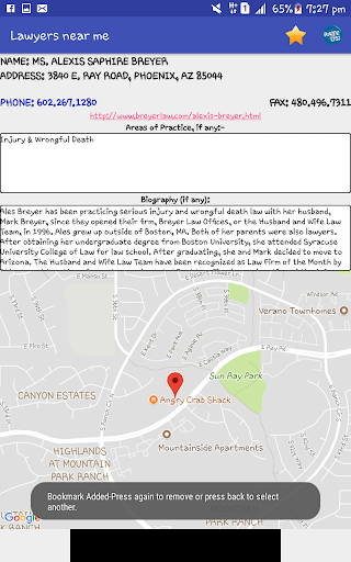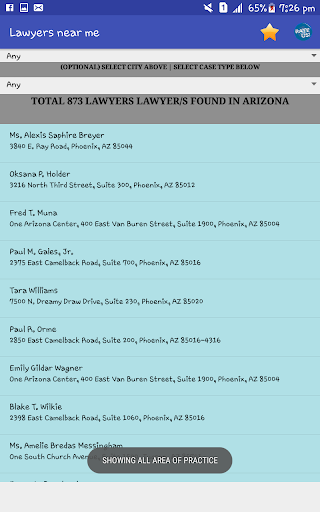each attorney details consists name, address, phone number, fax, areas of practice, city, website and a brief biography (subject to availability).