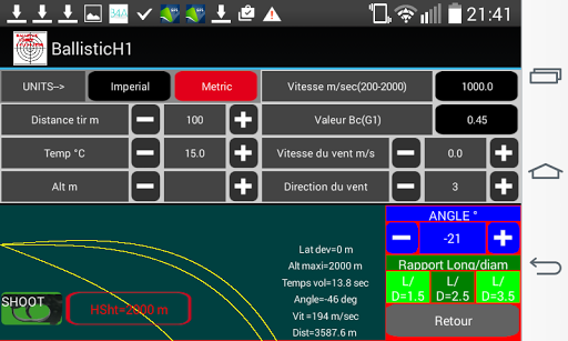 Addition: touche SLZ pour des tirs en angle à longue distance ; le coefficient L/D est le rapport longueur sur diamètre de la balle ; ce rapport sert à calculer le temps de chute pour des angles de tir élevés . L'effacement de l'écran se fait par appui long sur SHOOT
