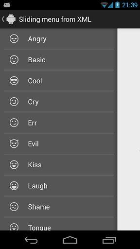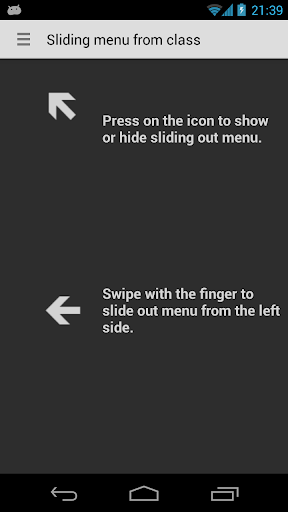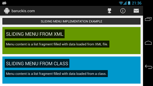 Sliding Menu Implementation Example is an example app, which shows how to do implementation of an Android library SlidingMenu developed by Jeremy Feinstein. It has two different approaches. First one demonstrates left side sliding out menu with a list fragment, as a content, filled with data loaded from XML file. Second one demonstrates left side sliding out menu with a list fragment, as a content, filled with data loaded from a class.