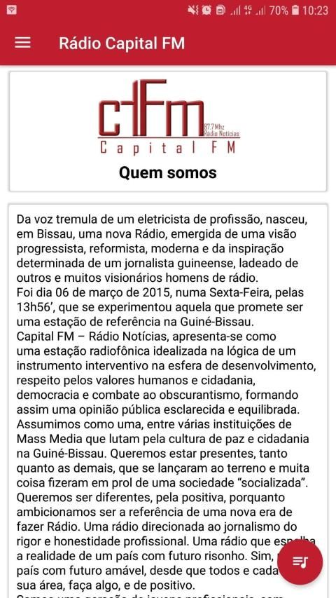 Capital FM - Rádio Noticias, presents itself as a radio station idealized in the logic of an intervention instrument in the sphere of development, respect for human values and citizenship, democracy and fight against obscurantism, thus forming an enlightened and balanced public opinion.