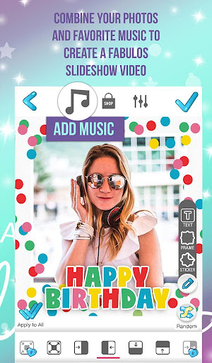 Why just create a personalized birthday card to send in a text when you can make a birthday video with photos? Spread love and joy among your friends and family! Easily create video photo slideshow with background music and special effect as a unique present. You get to design slide shows and videos for birthday with any pictures, quotes and wishes you want. You can have birthday cake with name and photo and song - everything you need in one amazing slideshow making app and video editor with text and stickers. Beautiful photo filters, birthday stickers for pictures, cute photo frames and effects - this fun video making app from photos with music has everything you need. Download “Birthday Video Maker - Bday Pictures Slideshow” app and start creating amazing bday videos from photos today!