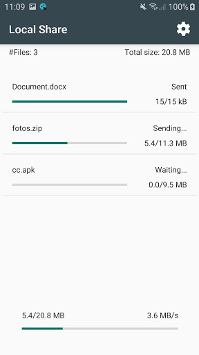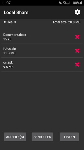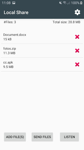 2) Select the files you want to send. This can be done either by opening the app and pressing "Add files" or by using the share button in another application.