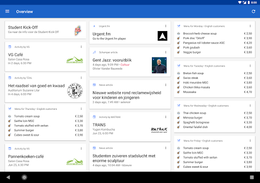 With Hydra you are always up-to-date on the latest news and activities of your favourite student association. Listen to Urgent.fm, read Schamper articles or decide if today's menu of the student restaurant is to your liking. Or go study and check if your favourite library is open today.