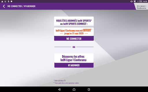 • ou à l’Abonnement mensuel : 1.99€ par mois avec tacite reconduction (7 jours d’essai gratuit pour tout nouvel abonné à l’application beIN Ligue 1 Conforama).