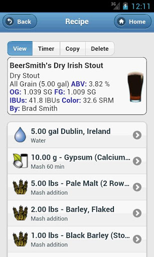 BeerSmith, the top selling home brewing software, comes to Android! BeerSmith Lite lets you search from thousands of beer recipes on our BeerSmithRecipes sharing site, and download and view them on your phone or tablet. The app is also tightly integrated with our desktop software and cloud recipe service, making it a snap to view your recipes on the go. An integrated brew day timer with notifications shows you step by step instructions for your recipes and plays an alarm as each completes. A beer style guide, ingredient reference, set of 7 brewing calculators and unit converters rounds out this great app!