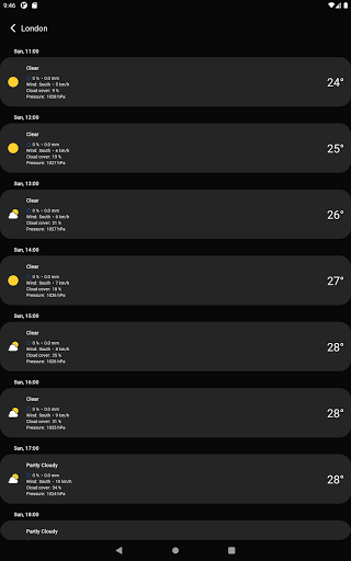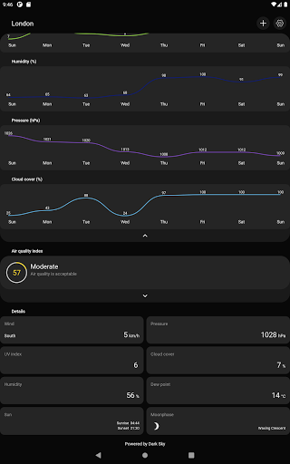 Other useful information: current temperature, humidity, dew point, air pressure, uv-index, cloud cover, wind speed and direction.