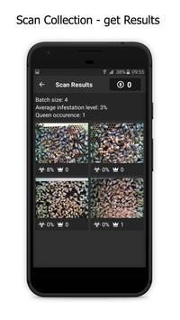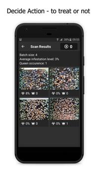 Create a collection of 10 -30 images, covering 2500 - 7500 bees. Press scan and images are instantly analyzed on our servers returning a result to you. The result can be used to determine need of treatment depending on infestation level and time of the season.
