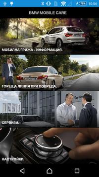 BMW Мобилна грижа е за всички притежатели на автомобили BMW, без значение от годината на производство, както и за всички фенове на марката. Може да разчитате на BMW Мобилна грижа 24 часа в денонощието, 7 дни в седмицата, 365 дни в годината, както във собствената ви държава, така и зад граница. Услугата мобилна грижа се предлага безплатно за собствениците на BMW закупени след 01.01.2009 за срок от пет години. Вашия сервизен партньор с удоволствие ще ви предостави подробна информация и възможности за закупуване на допълнителни пакети. В случай, че нямата такъв, BMW Mobile care се заплаща при потребление.