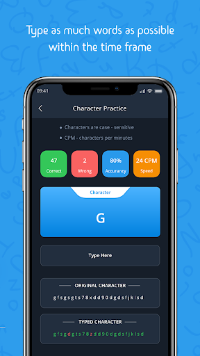 - Get the statistics Characters Per Minute of the typed character with the best Typing Master app.