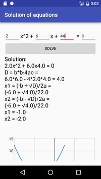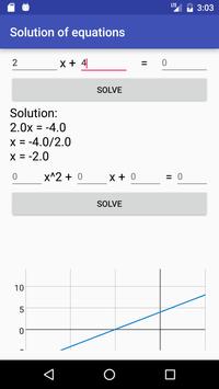 Solution of two main types of the equations: 1)ax b = c(Ususal equations) 2)ax^2 bx c=d(Quadratic equations) It's the best application for Math at school Here you can see solution of equation and it's graph!