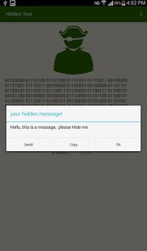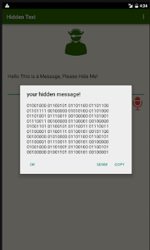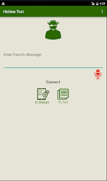 Have you ever wanted to share with your close friend a secret message that is human unreadable?Or even wanted to write your secret diary and save it as "some code" that your non-geeky nosy relatives cannot understand?..If yes, then Hidden Text app will help to record by voice or text your messages and then convert it to Binary codes (machine language) that human cannot understand. An easy to use app with simple user interface, what you need is to record your message or type it and then convert it 0 1 codes, copy it to a word file , or send an email to your self or share with your friend to have some fun.....Hidden Text app; when you realize that you are a geek !