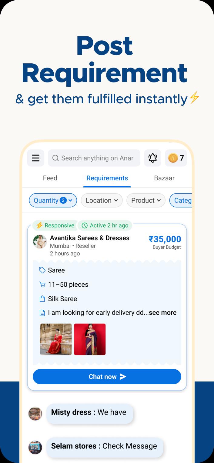 Search for your buyers and connect with them on Anar. Can’t find some of your buyers? Invite them on Anar so that they can see your updates daily and also get buyers business requirements like in IndiaMart, TradeIndia, JustDial, JDMart, WhatsApp Business, Udaan & Meesho.