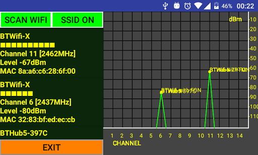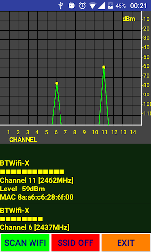 Lists the SSID, WiFi Channel, MAC Address and signal level in dBm.