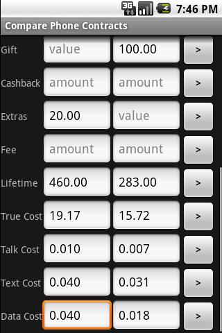In the App you enter several contract factors, you get to see the differences between two mobile phone plans side-by-side. The App calculates the true monthly cost of the contract to help you decide on the best value plan. It also calculates the unit cost of each talk minute, text or data megabyte which can also help with determining best value for money.