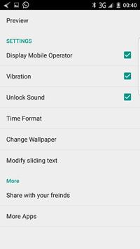 ★Multiple settings like background wallpaper, vibrate, sound, date format, sliding text etc.