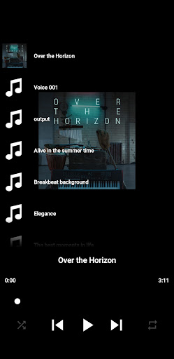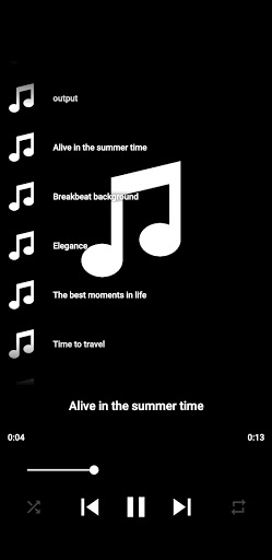 This app allows users to play music and audio files on a single screen without having to jump back and forth between screens. Simply play your songs. Click repeat to play song on a loop. Click shuffle to automatically choose a song at random. This music player uses a dark background for less eye strain.